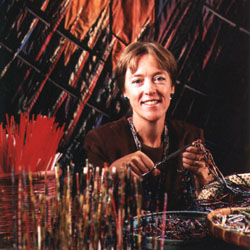 Judith Content creates hand-dyed, pieced, quilted and appliqued silk wall pieces for corporate and residential environments. She uses an unique adaptation of the Japanese "shibori" dye technique called "bomaki." Traditionally "bomaki" involved wrapping and tying fabric round thirteen meter poles. The tightly pleated fabric was dyed deep blue indigo and used to make kimonos. The thread used to secure the fabric and the manipulated pleats created an intricate resist patttern of infinite variations. Judith chooses to dye smaller pieces of a large variety of silks on clear glass bottles. She pre-pleats the silk using intricate folding techniques and secures the silk to the bottle with fine threads. Boiling dye is applied to the bottles by a dipping and pouring procedure. Both the pleates and the threads act to resist the dye creating dramatic patterns of complex colorations. The dyed silks are then torn up and reassempled into pieced, quilted and appliqued panels. The completed pieces range in size from single panels and interpretations of the kimono form to large-scale, site-specific installations. Her work reflects a passion for color as it explores natural phenomena such as cloud formations, sheets of rain, fire storms and water in many forms. Collections include Tropicana corporation, Chevron, Synopsis and Varian. Her work has been exhibited nationally and internationally through the American Craft Museum. Her work has been shown in Japan through several invitational exhibitions of shibori and twice purchased for permanent collections there. Publications include national and internations journals, most recently the Autumn 1994 issue of Ornament Magazine as well as Shibori II by Yoshiko Wada. Her 1995 exhibitions included "The Kimono Inspiration" at the Textile Museum in Washington D.C. and "Diversity!" part if the Art Quilt Conference at Arrowmont, Tennessee. Other directions in Judith Content's work include production of intricate collage neckpieces that incorporate the artist's own hand-painted paper beads. Multi-stranded, these one-of-a-kind pieces may include miniature hand-painted paper fans or simulated pottery fragments created from painted polymer clay. She collects and incorporates beads from all over the world as well as ethnic findings and items that she enhances with paint, gold leaf and glazes. Her neckpieces reflect the artist's travels and experiences as well as her collections of textiles, folk art and ceramic vessels. Return to the Virtual Gallery